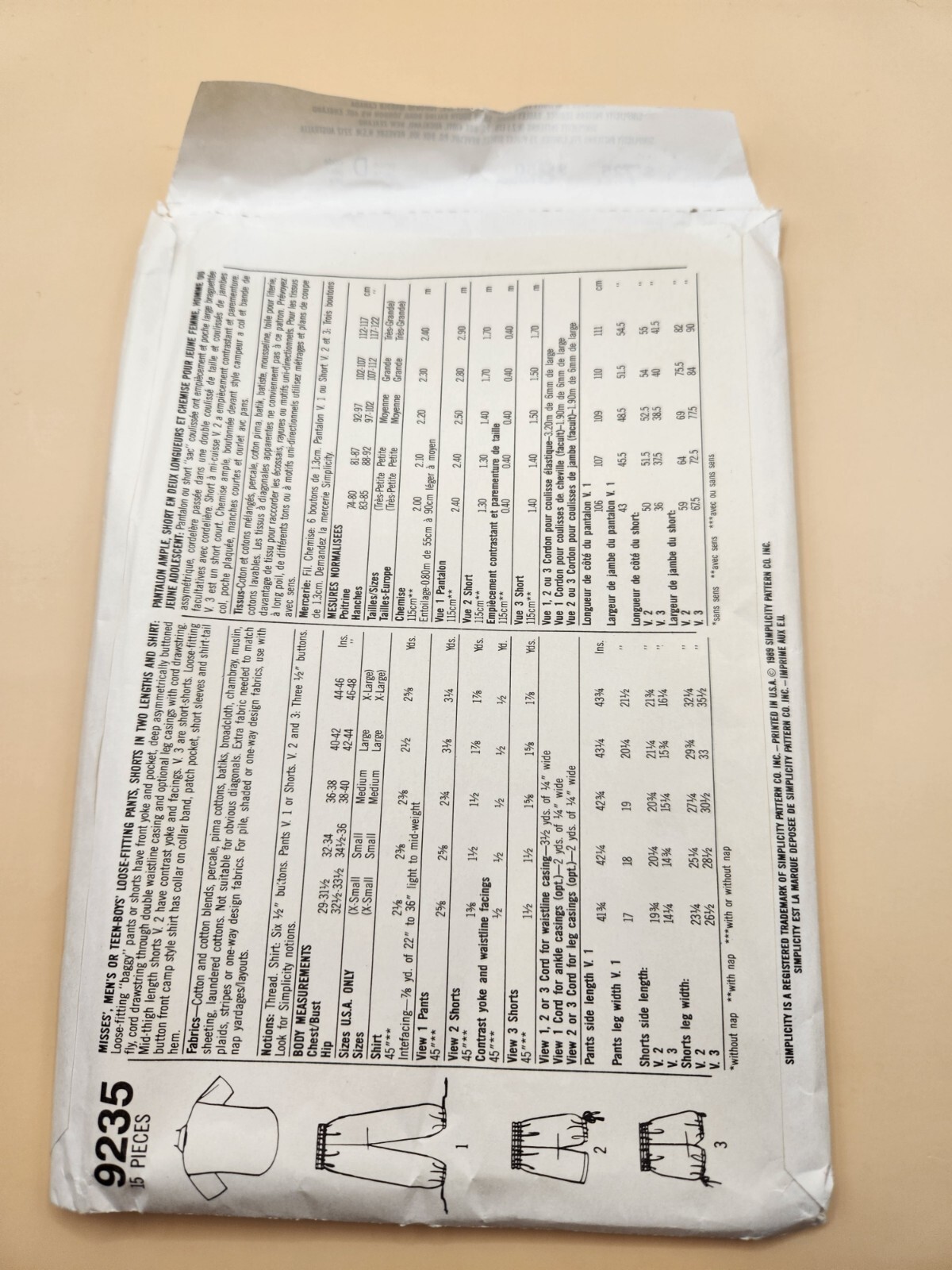 Vtg Simplicity Sewing Pattern 9235 Unisex Most Sizes Pants Shorts Shirt Ff Ebay